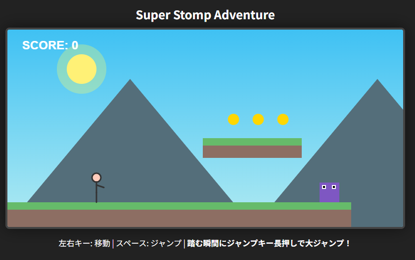 作り方はいたって簡単である。Geminiのプロンプトに「Javascript で横スクロールゲームを作成したい。サンプルコードを書いて」と入力し、その後、足りない機能をひとつずつ追加依頼していった。